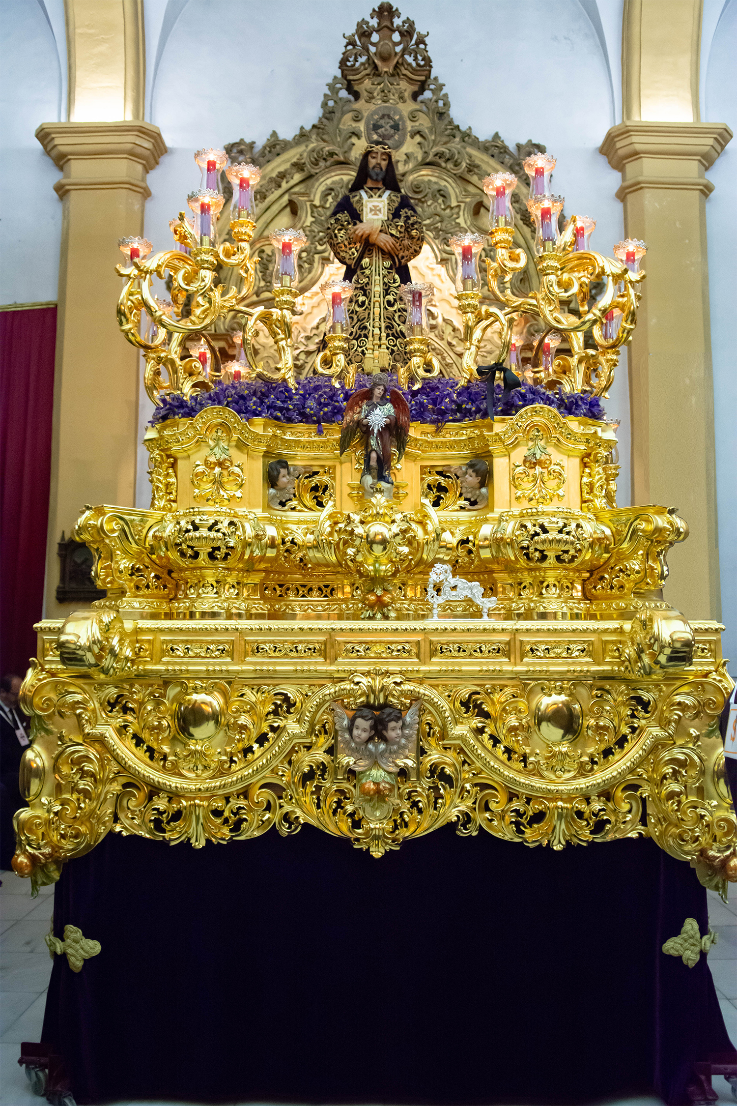 El exorno floral del paso alterna entre claveles rojos, claveles rojo sangre y lirios morados.